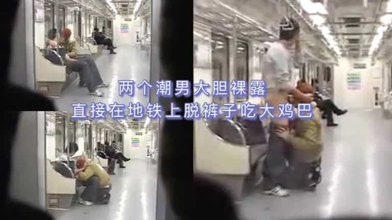 两个潮男在地铁上胆子真大,直接脱裤子当众吃大鸡巴,硬到不行