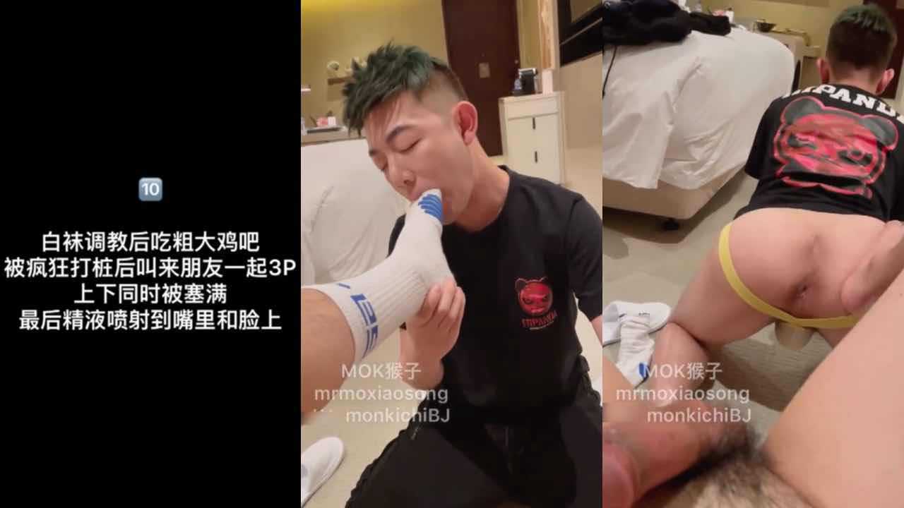 白袜调教后吃粗大鸡吧,被疯狂打桩后叫来朋友一起3P,上下同时被塞满,最后精液喷射到嘴里和脸上